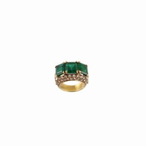in oro giallo a fascia con tre smeraldi rettangolari del peso complessivo di 7,50 ct ca. disposti in linea su [..]