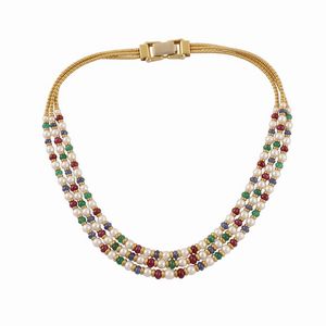 a tre fili di perle alternate a rondelle in oro giallo, rubini, zaffiri e smeraldi, raccordati alla chiusura [..]