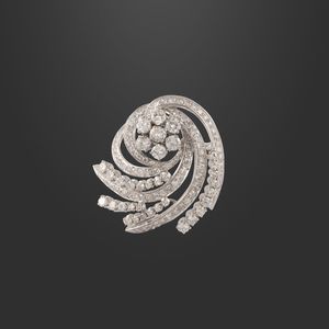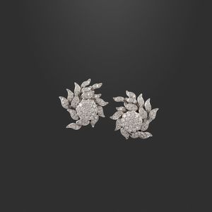 a clip in oro bianco ciascuno con fiore stilizzato in brillanti (uno mancante) del peso complessivo di 3,80 ct [..]