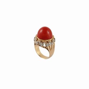 a fascia costolata in oro rosa con corallo cabochon contornato da un motivo a festone in palladio con piccoli [..]