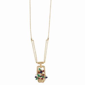 a tre file di segmenti snodati in oro giallo intervallati da rubini, zaffiri, smeraldi e brillante, gr. 69,8. [..]