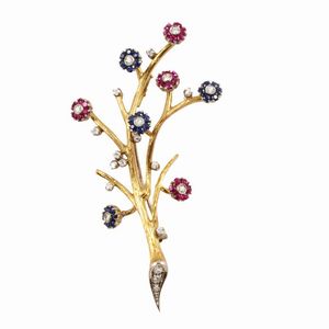 en tremblant raffigurante un tralcio fiorito realizzata in oro bianco e giallo con diamanti, rubini e zaffiri, [..]