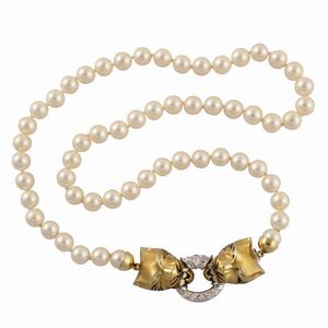 ad un filo di perle 7 mm con chiusura anteriore a due teste di tigre contrapposte in oro giallo e bianco con [..]