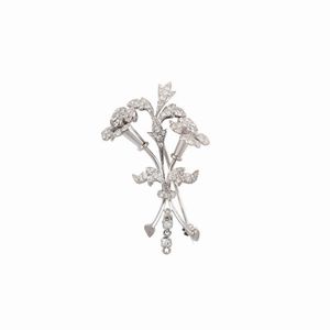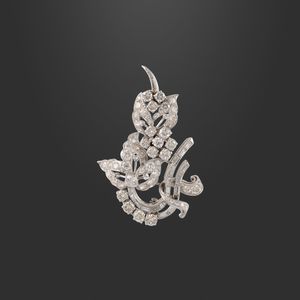 doppio uso, in oro bianco a tralcio fiorito e fogliato con diamanti ad ornamento, gr. 10. Dimensioni 5 x 3,2 [..]