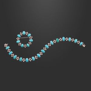 in oro bianco composta da bracciale e spilla con turchesi alternati a motivi in geometrici con brillanti del [..]