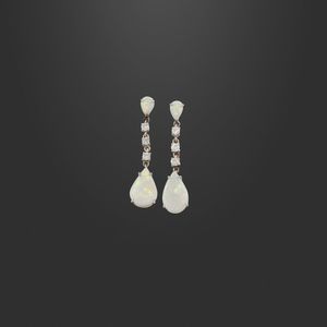 pendenti in oro bianco, ognuno con opali nobili arlecchino a goccia e brillanti, gr. 3,4. Lunghezza 3,3 cm ca. [..]