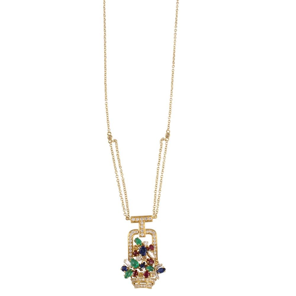 in oro giallo raffigurante un cestino fiorito stilizzato con diamanti, zaffiri, rubini e smeraldi cabochon, sostenuto da una sottile catena ornata da due piccoli brillanti, gr. 10,2.