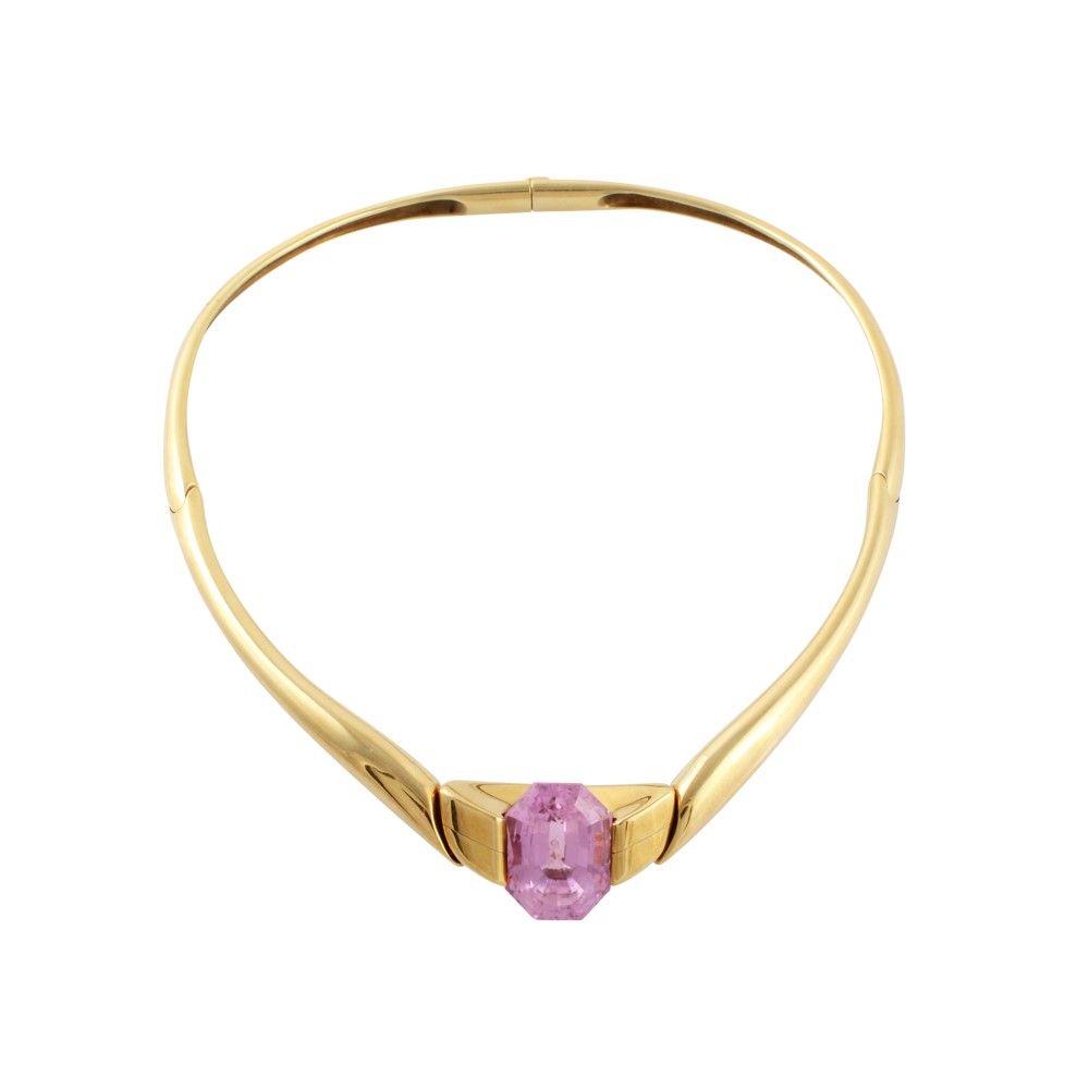 semirigido in oro giallo costituito da segmenti snodati, evidenziato al centro da una grande kunzite ottagonale sfaccettata del peso di 36,60 ct ca., gr. 90,8.