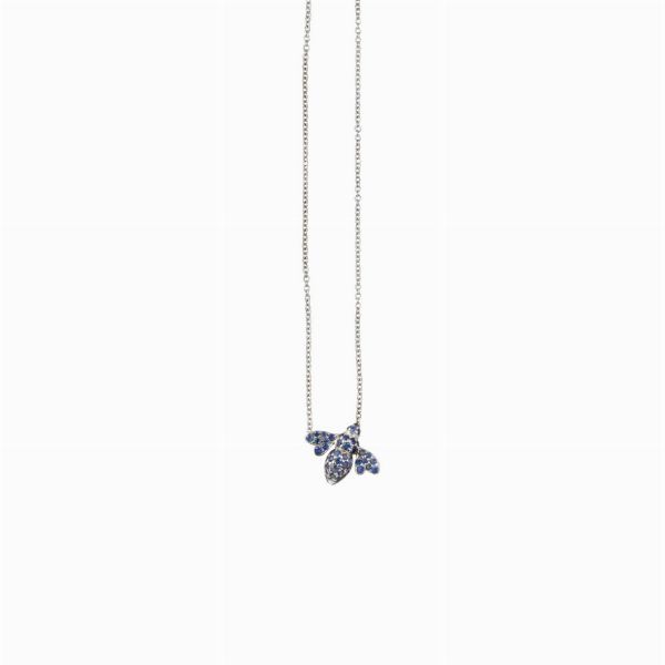 in oro bianco con pendente raffigurante un'ape in pavé di zaffiri e catenina, gr. 40. Corredato da astuccio originale.