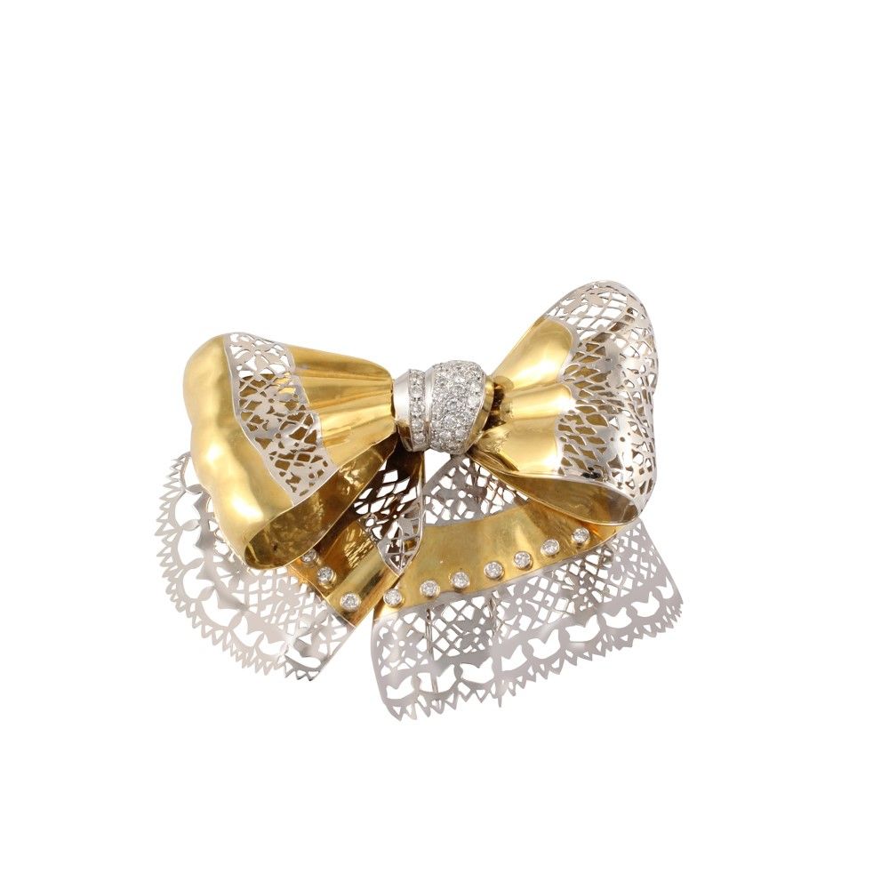 in oro giallo e bianco modellata a fiocco in parte finemente traforata a merletto, ornata da brillanti del peso complessivo di 2,10 ct ca, gr. 58,1.