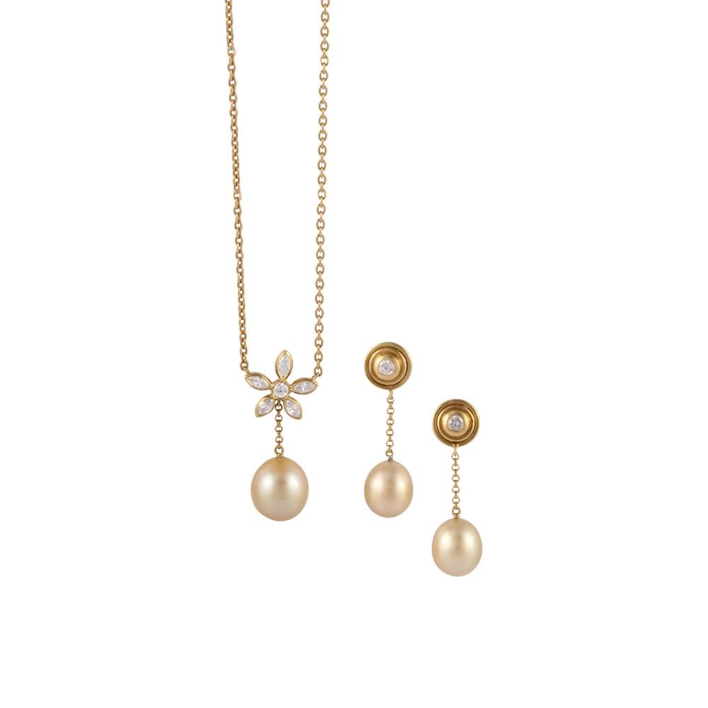 in oro giallo composto da girocollo con motivo a fiore in diamanti e perla South Sea gold 15 / 13,5 mm ca. sospesa e orecchini pendenti ognuno con motivo circolare centrato da un brillante e perla South Sea gold 13,5 / 12 e 13,5 / 11,5 mm ca. terminale, gr. complessivi 24,1. Brillanti del peso complessivo di 1 ct ca.
