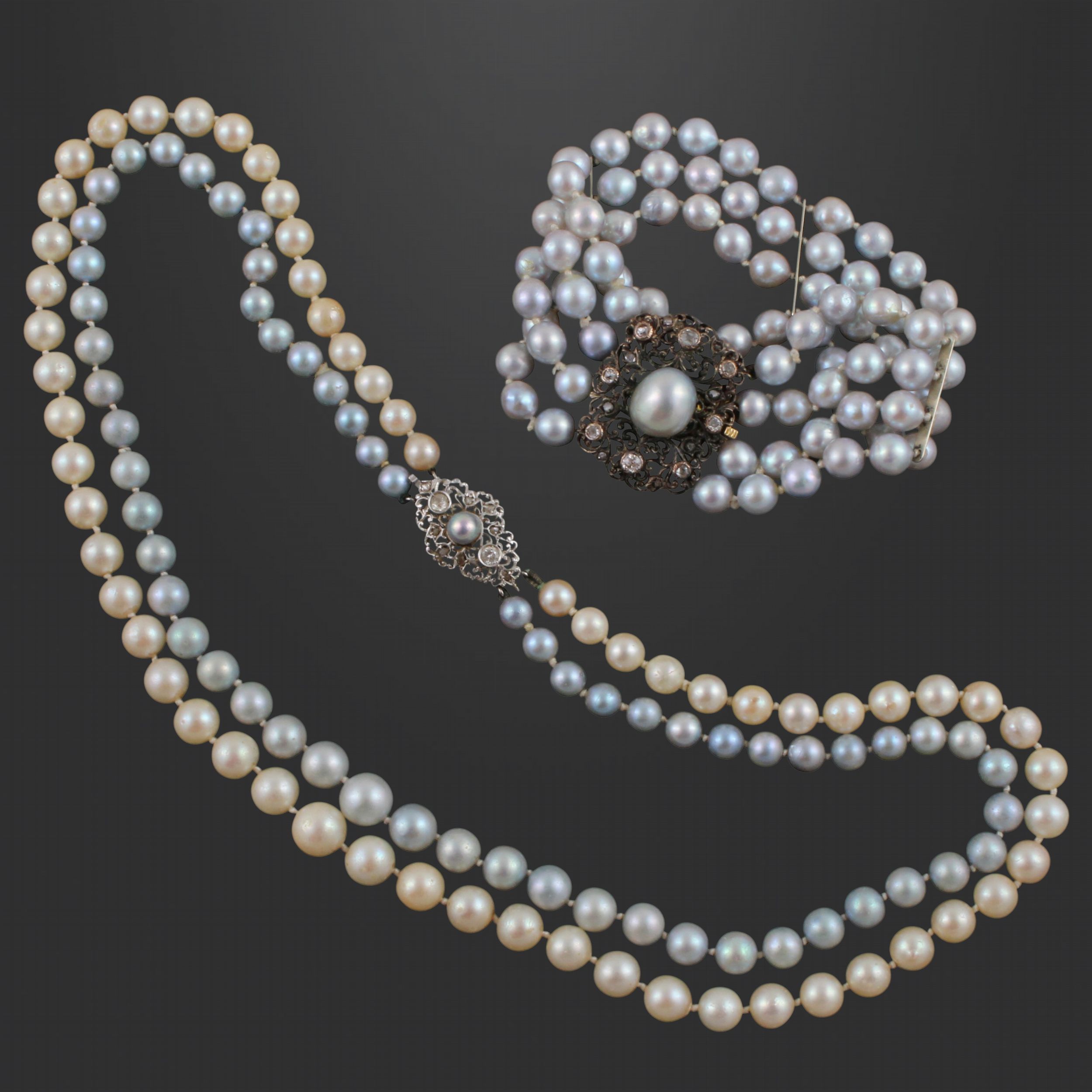 composto da bracciale a quattro fili di perle grigio-azzurro (colore indotto artificialmente) con chiusura traforata in argento e oro, diamanti, perla e collana a due fili di perle crema e grigio-azzurro (colore indotto artificialmente) poste a scalare, con chiusura traforata in oro bianco, diamanti e perla.