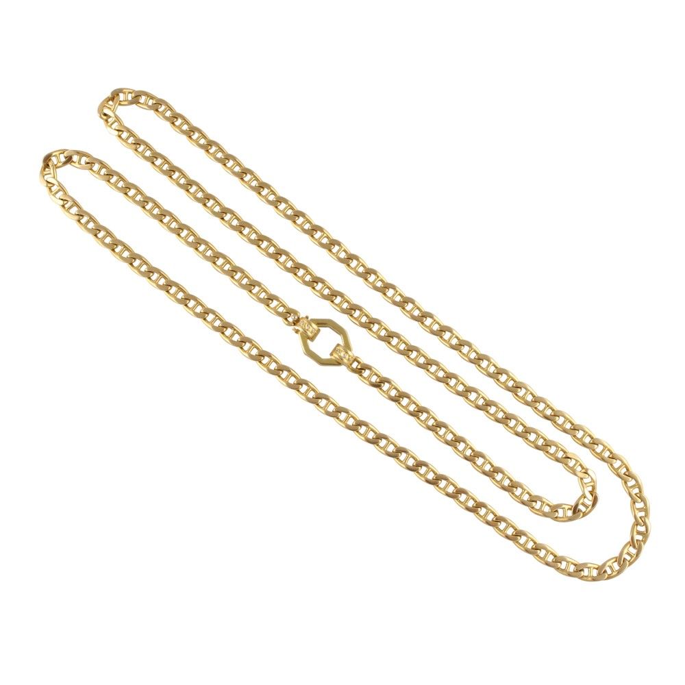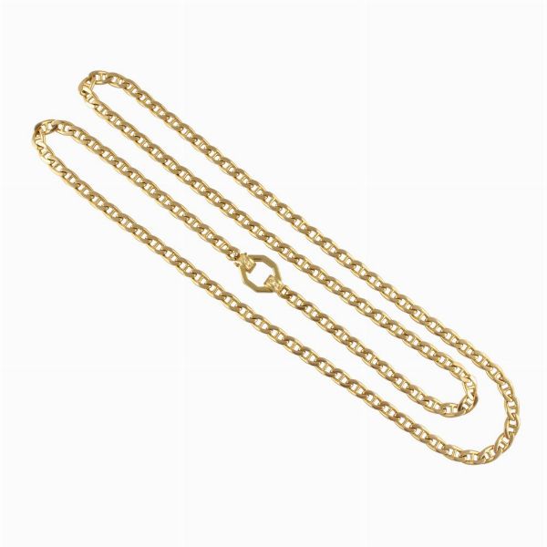 a maglia marina piatta in oro giallo con chiusura ottagonale ornata da cavallotti con piccoli brillanti, gr. 125.