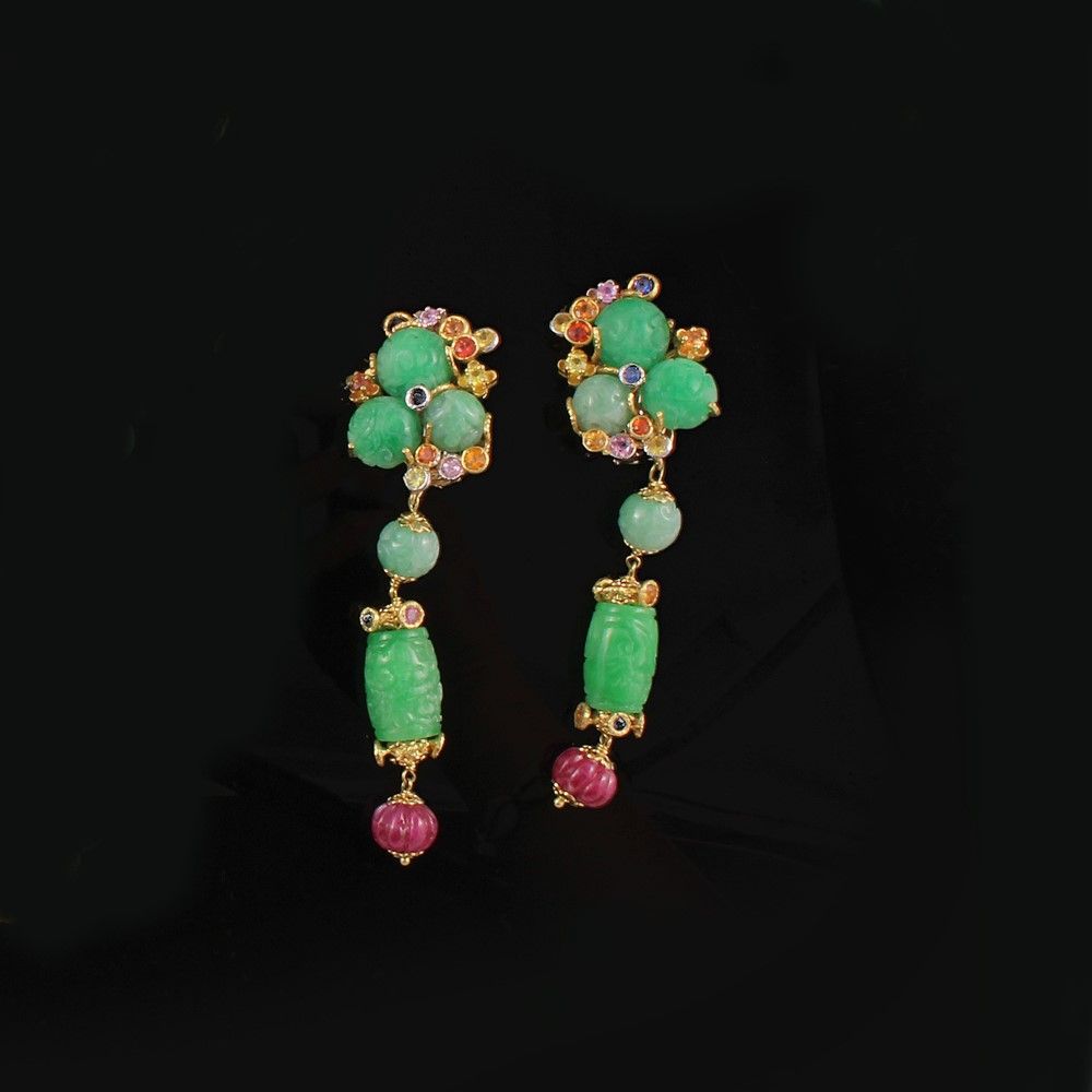 a clip pendenti in oro giallo e bianco con giadeiti incise, corindoni e rubino a sfera costolata, gr. 47,7.