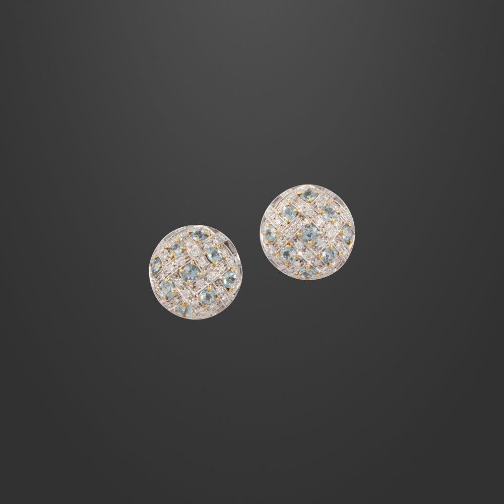 a clip in oro bianco con motivo intrecciato impreziositi da brillanti del peso complessivo di 1,70 ct ca. e acquamarine, gr. 21,7.