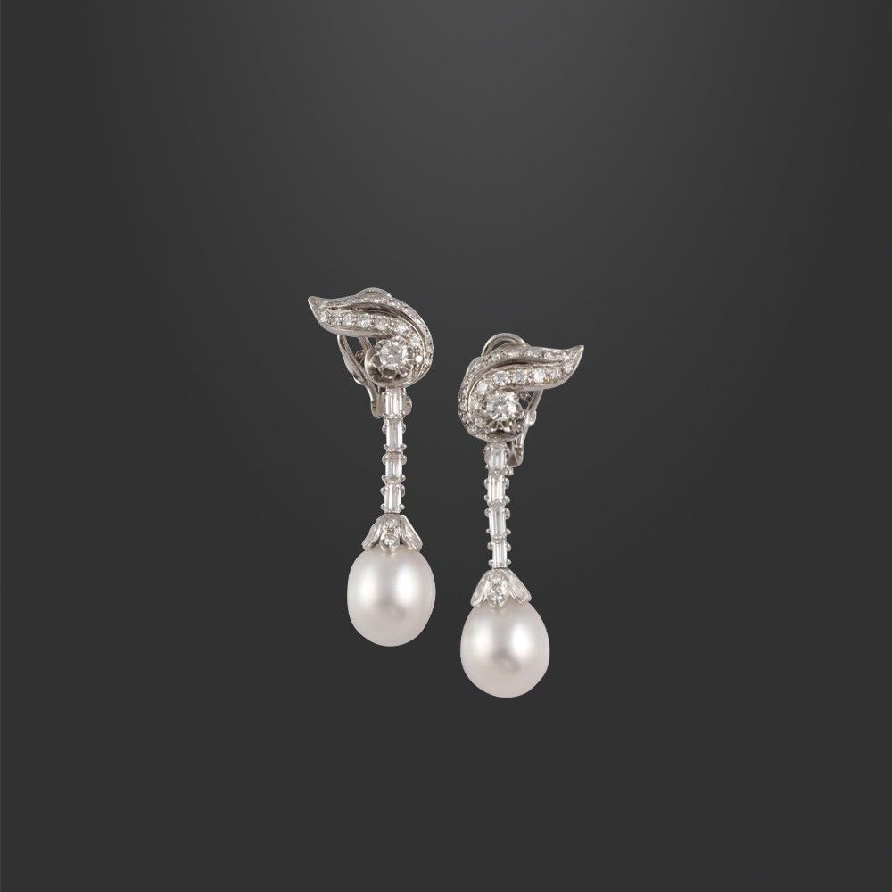 pendenti in oro bianco, ciascuno con brillanti e diamanti baguettes del peso complessivo di 1,20 ct ca. e perla ovale sospesa 10 / 11,5 mm, gr. 10,3.
