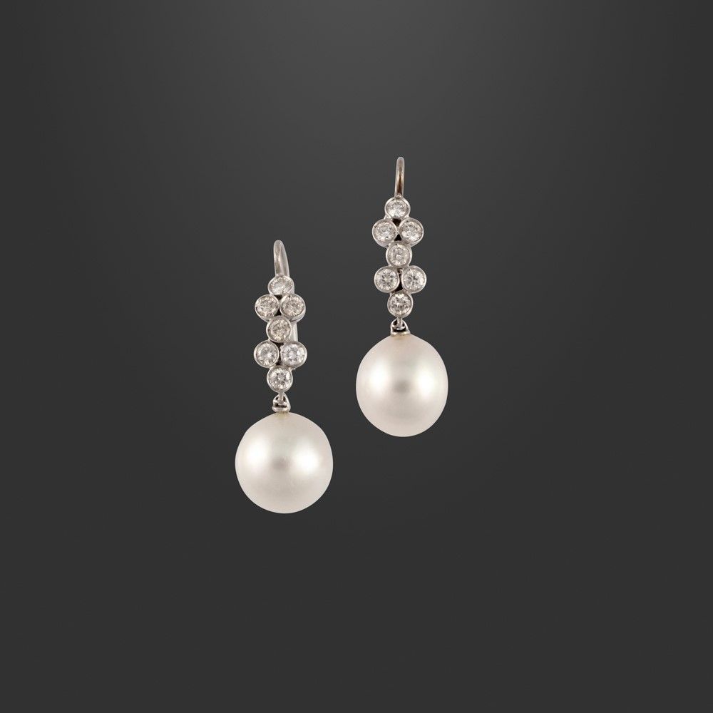 pendenti in oro bianco ciascuno con perla South Sea 12,5 mm sospesa ad un motivo a cascata con brillanti del peso complessivo di 0,70 ct ca., gr. 9.