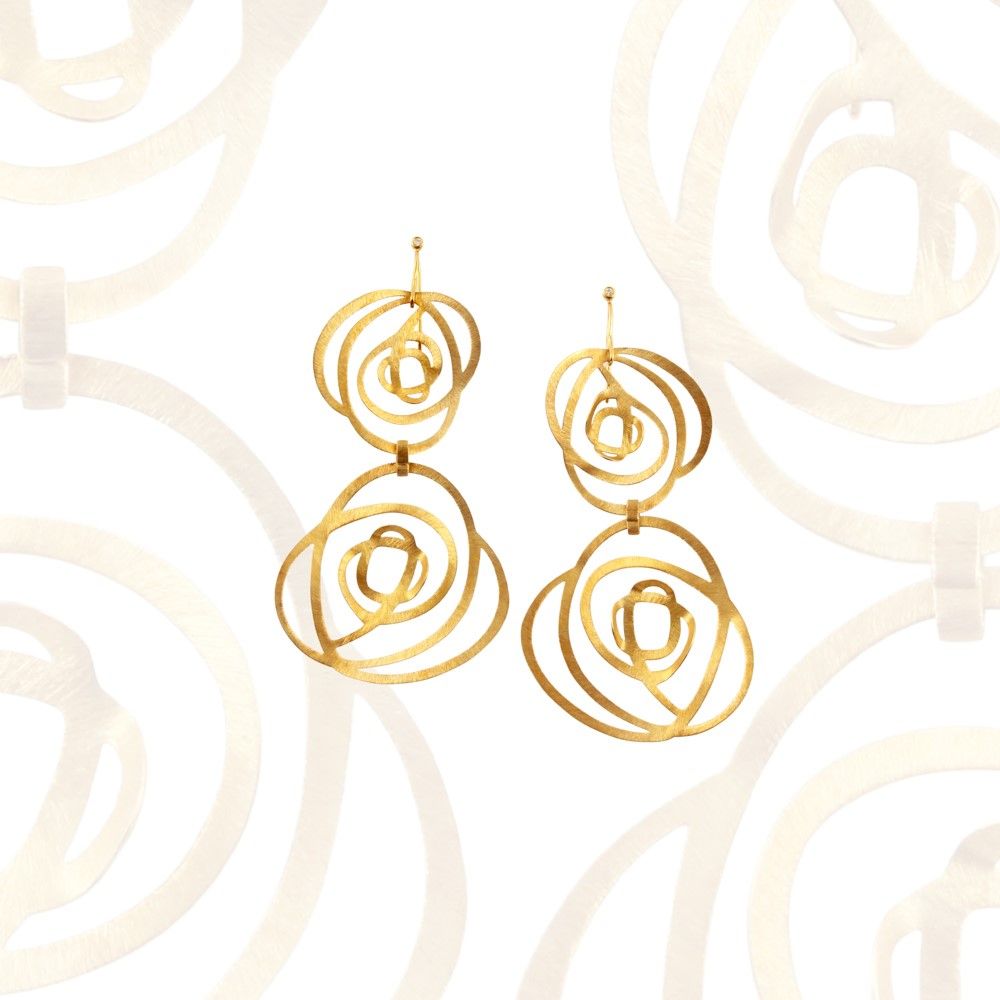 pendenti in oro giallo ciascuno con due motivi circolari disposti in linea sormontati da un piccolo brillante, gr. 10,2.