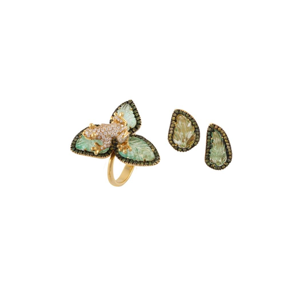 in oro giallo costituita da anello ornato da smeraldi di cui tre di dimensioni maggiori incisi a guisa di foglia, sormontato da una ranocchia in pavé di brillanti, orecchini in oro con smeraldi en suite, gr. complessivi 17,6.