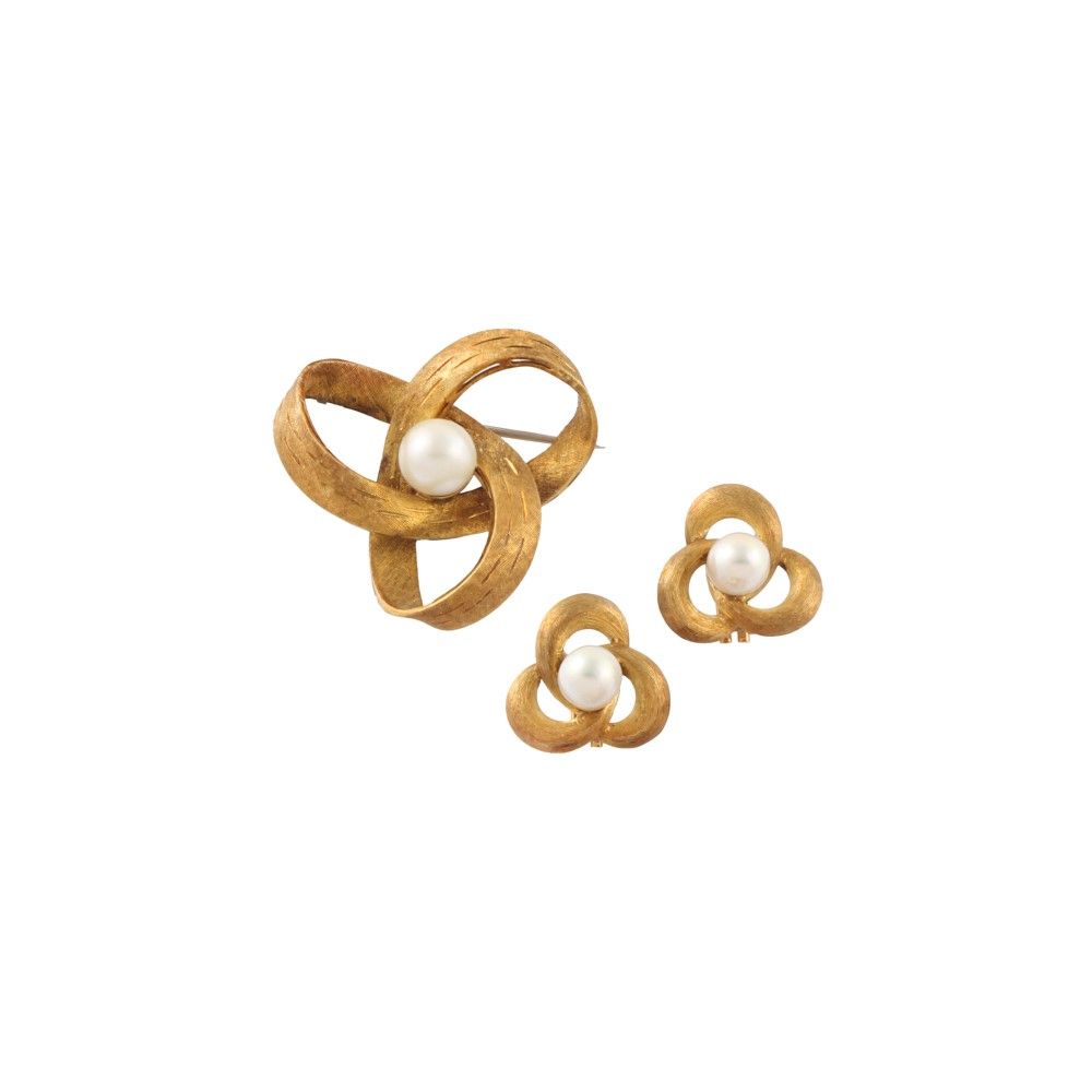 costituita da spilla e orecchini a clip in oro giallo e perle, gr. complessivi 21,2.