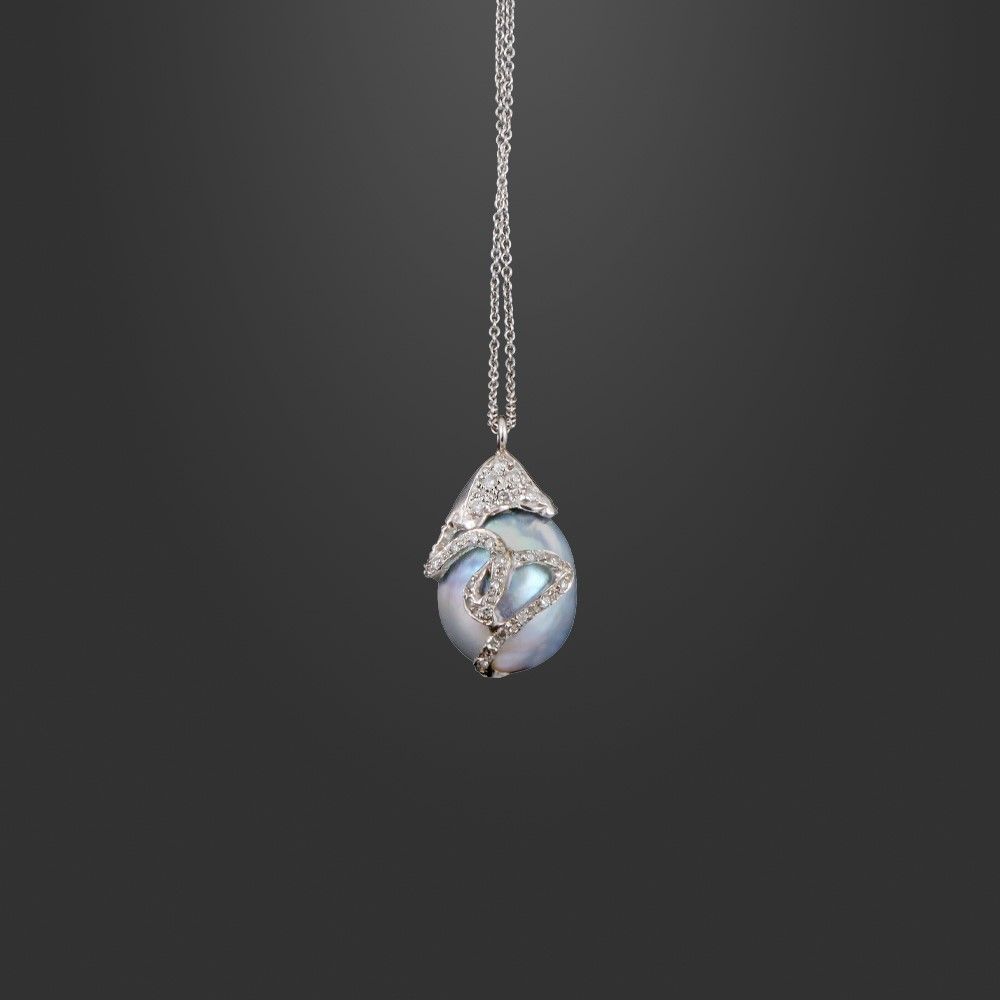 in oro bianco con perla South Sea scaramazza avvolta da un motivo sinuoso con piccoli brillanti (uno mancante), sostenuto da una sottile catena, gr. complessivi 8,7.