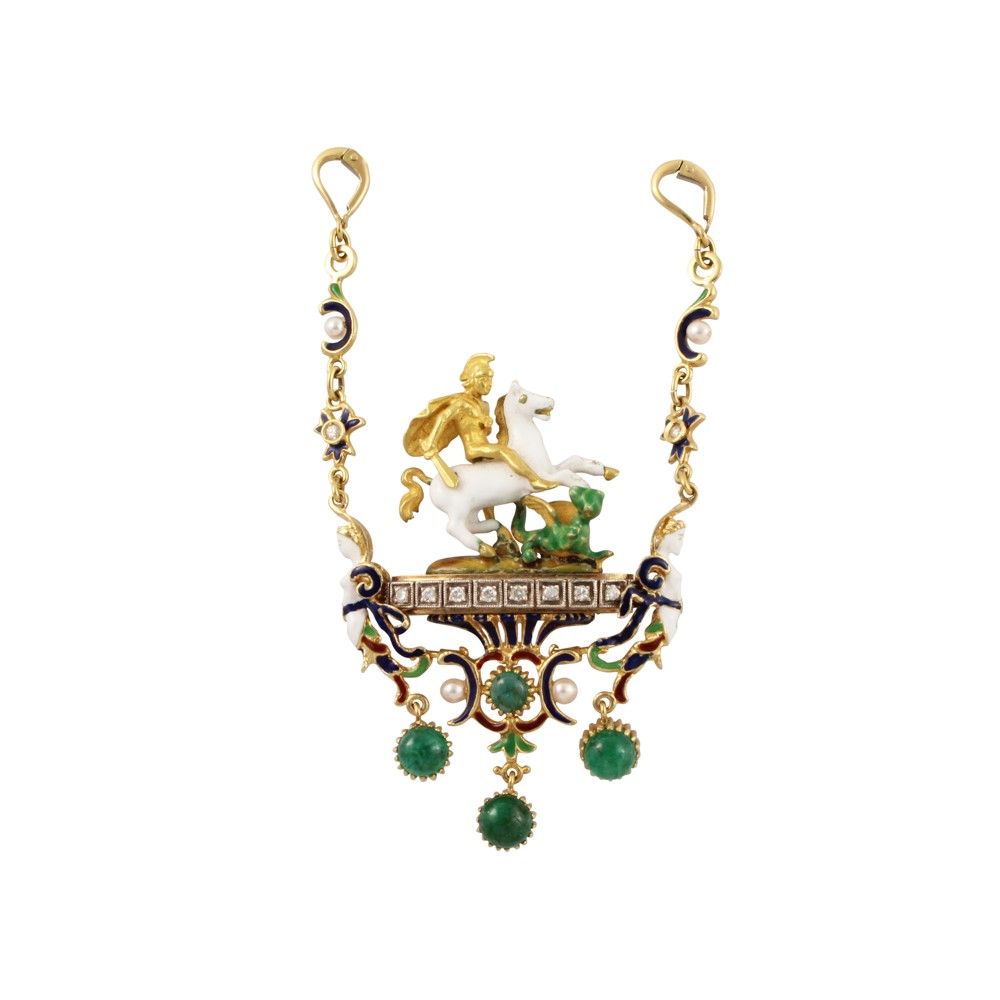 di gusto rinascimentale, realizzato in oro e argento raffigurante San Giorgio e il drago con brillanti, smeraldi cabochon, perle e smalti policromi (piccole mancanze), gr. 34,8.