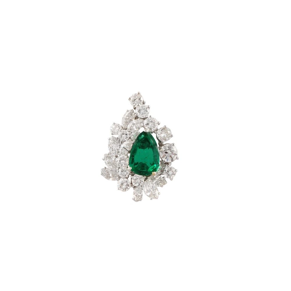 in platino con smeraldo a goccia centrale del peso di 2,30 ct ca. contornato da brillanti e diamanti navettes, del peso complessivo di 4 ct ca., gr. 9. Analisi gemmologica n. 55134 del 20/06/2023 rilasciata dal laboratorio IGI di Milano attestante che lo smeraldo è di provenienza Colombia