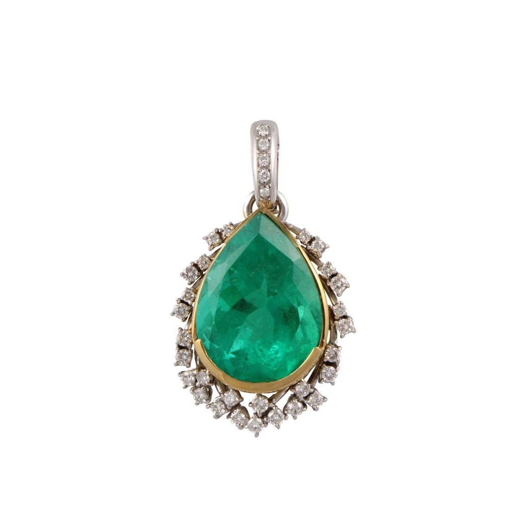 grande smeraldo a goccia del peso di 32,81 ct con pendente in oro giallo e bianco profilato da un motivo traforato in brillanti ripresi anche sulla contromaglia, gr. 23,5.