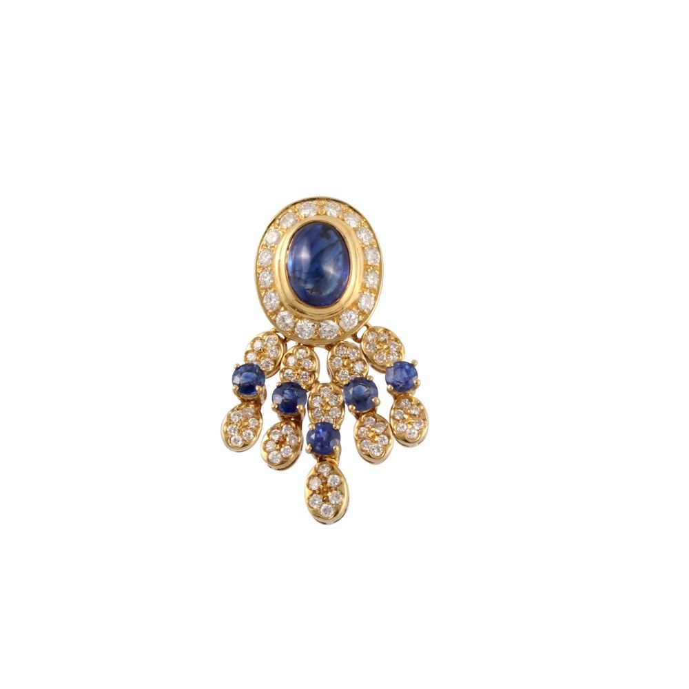 in oro giallo con zaffiro cabochon ovale contornato da brillanti ornato da cinque pendenti a cascata con zaffiri e brillanti, gr. 9,8.