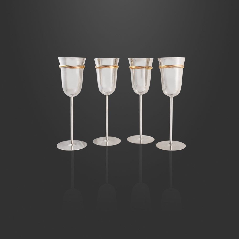 in argento 925 con decoro intrecciato in oro a tre colori, gr. complessivi 722, altezza 21 cm ca. Corredati da custodia originale.