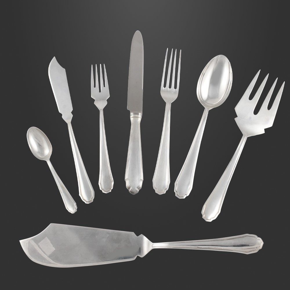 in argento composto da 344 pezzi, manici con decoro geometrico, gr. complessivi 16.433 (escluse le posate con parti in acciaio).