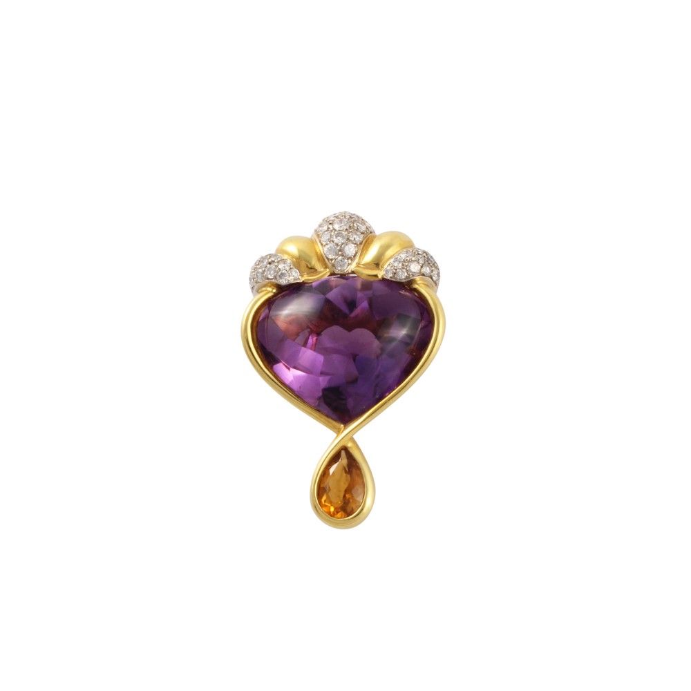 in oro giallo e bianco con grande ametista a cuore e quarzo citrino a goccia, sormontata da un motivo costolato in parte ornato da pevé di brillanti del peso complessivo di 1 ct ca, gr. 28,7.