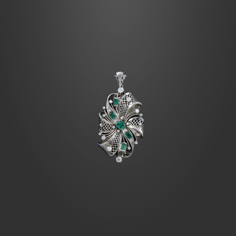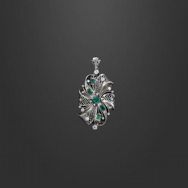 in oro bianco traforata impreziosita da smeraldi e diamanti, gr. 24,2.
