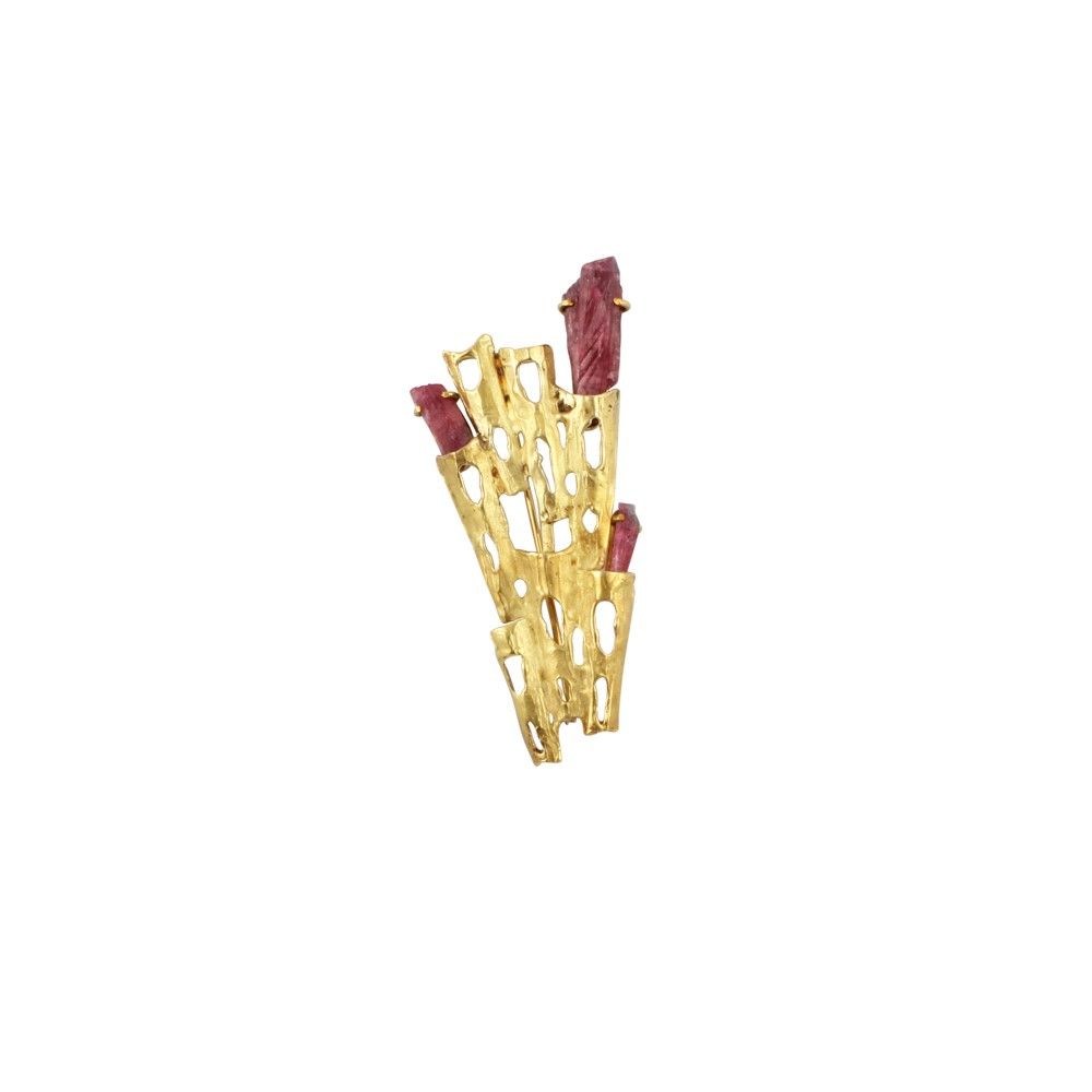 in oro giallo satinato a forma stilizzata con cristalli di tormalina, gr. 26,2.