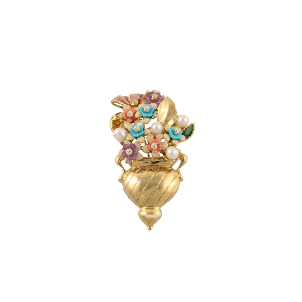 in oro giallo raffigurante un vaso fiorito con perle d'acqua dolce, pietre sintetiche e smalti policromi (lievi mancanze), gr. 24,8.