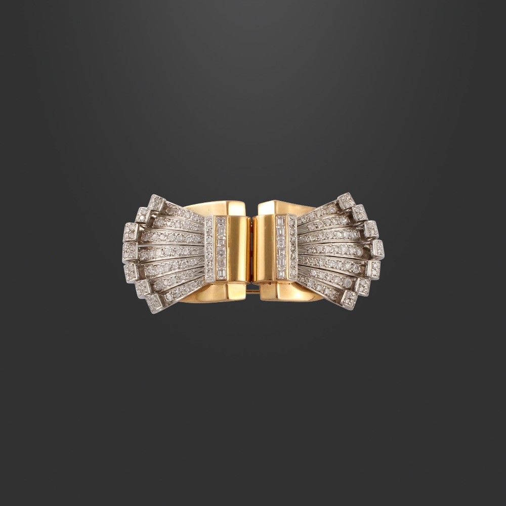 in oro giallo e platino a forma rettangolare con motivi contrapposti a ventaglio in brillanti e diamanti baguettes del peso complessivo di 2,70 ct ca., gr. 41,5.