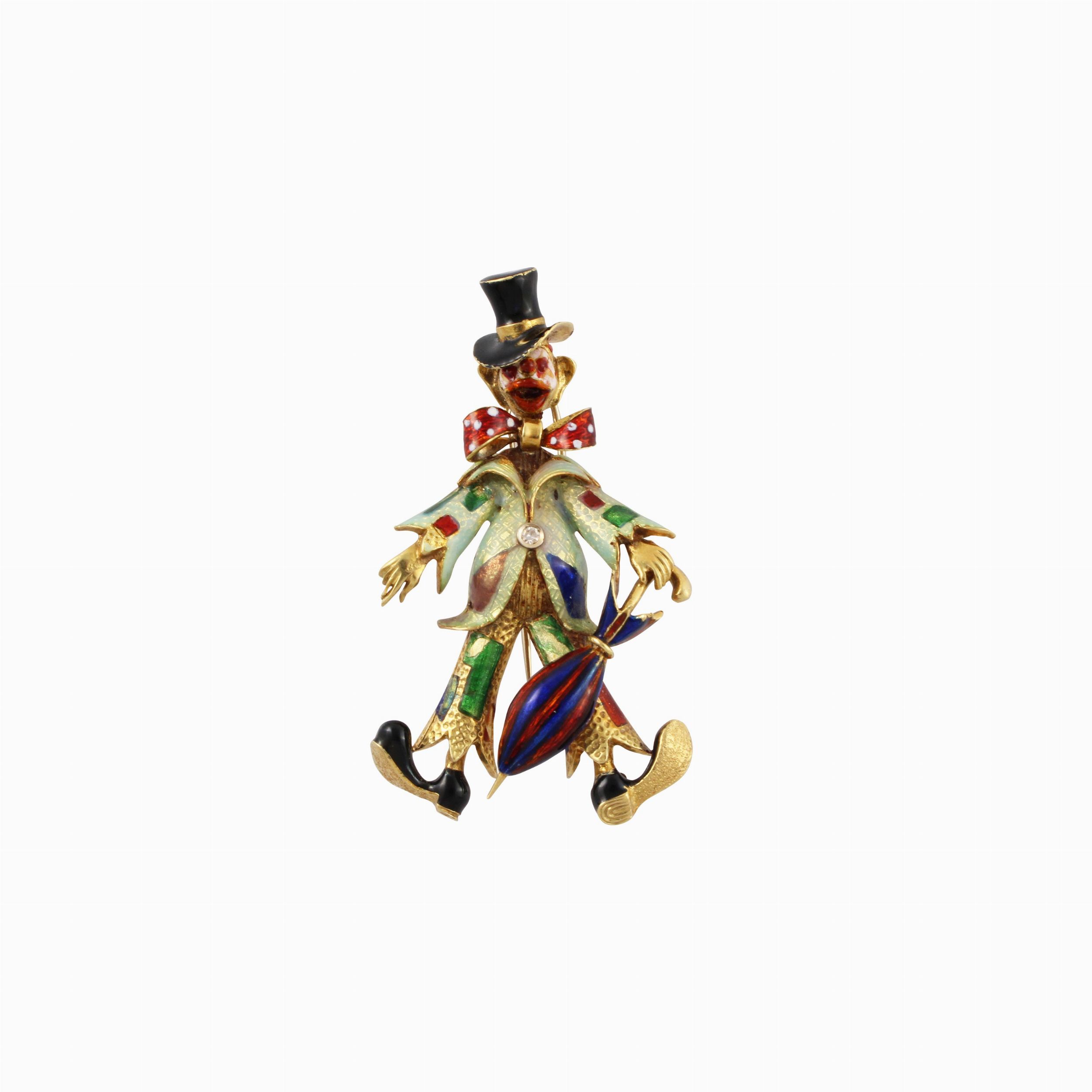 in oro giallo raffigurante un clown con smalti policromi (piccole mancanze) e diamante, gr. 25,5.