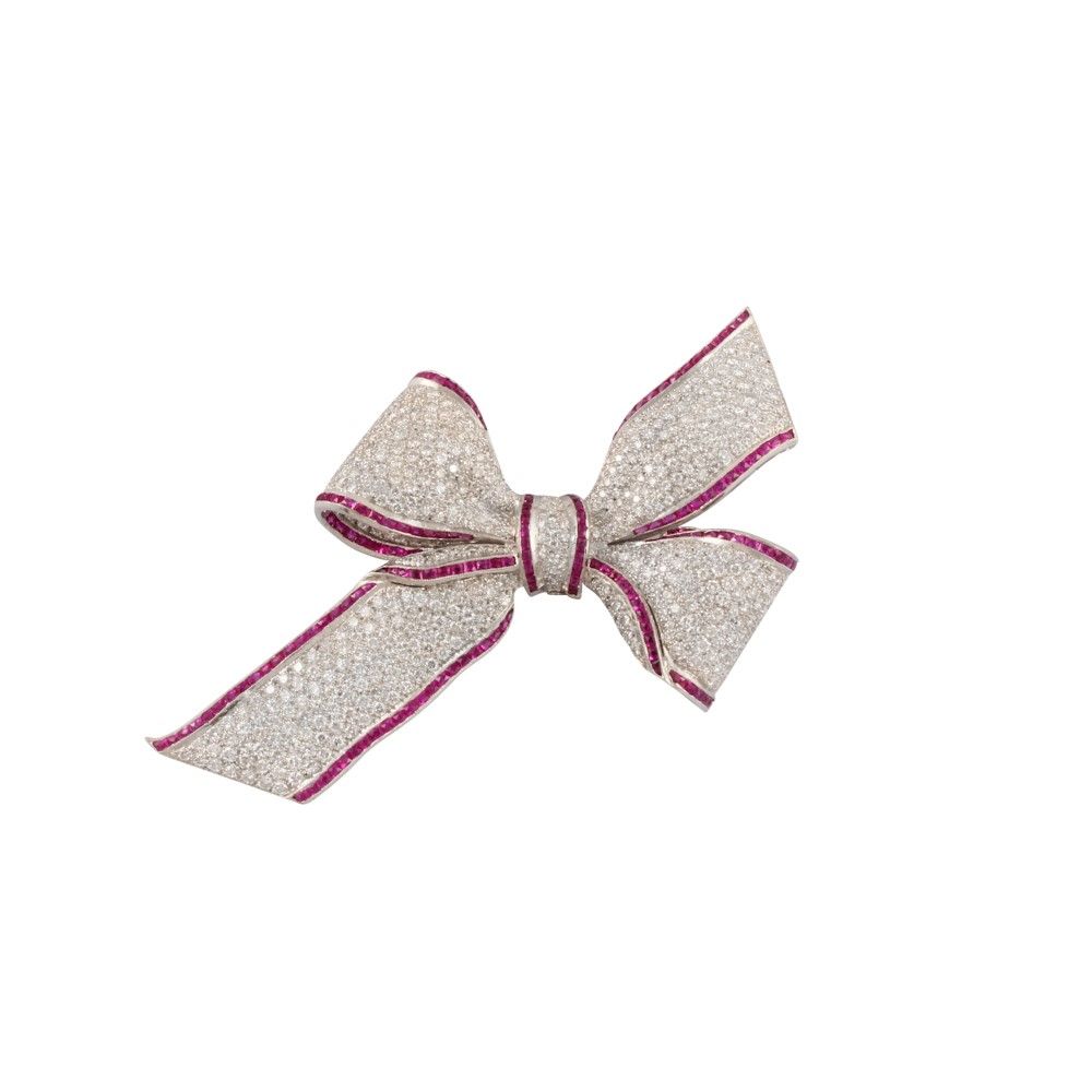 a fiocco in oro bianco con pavé di brillanti del peso complessivo di 9 ct ca. profilata da rubini, gr. 41,8.