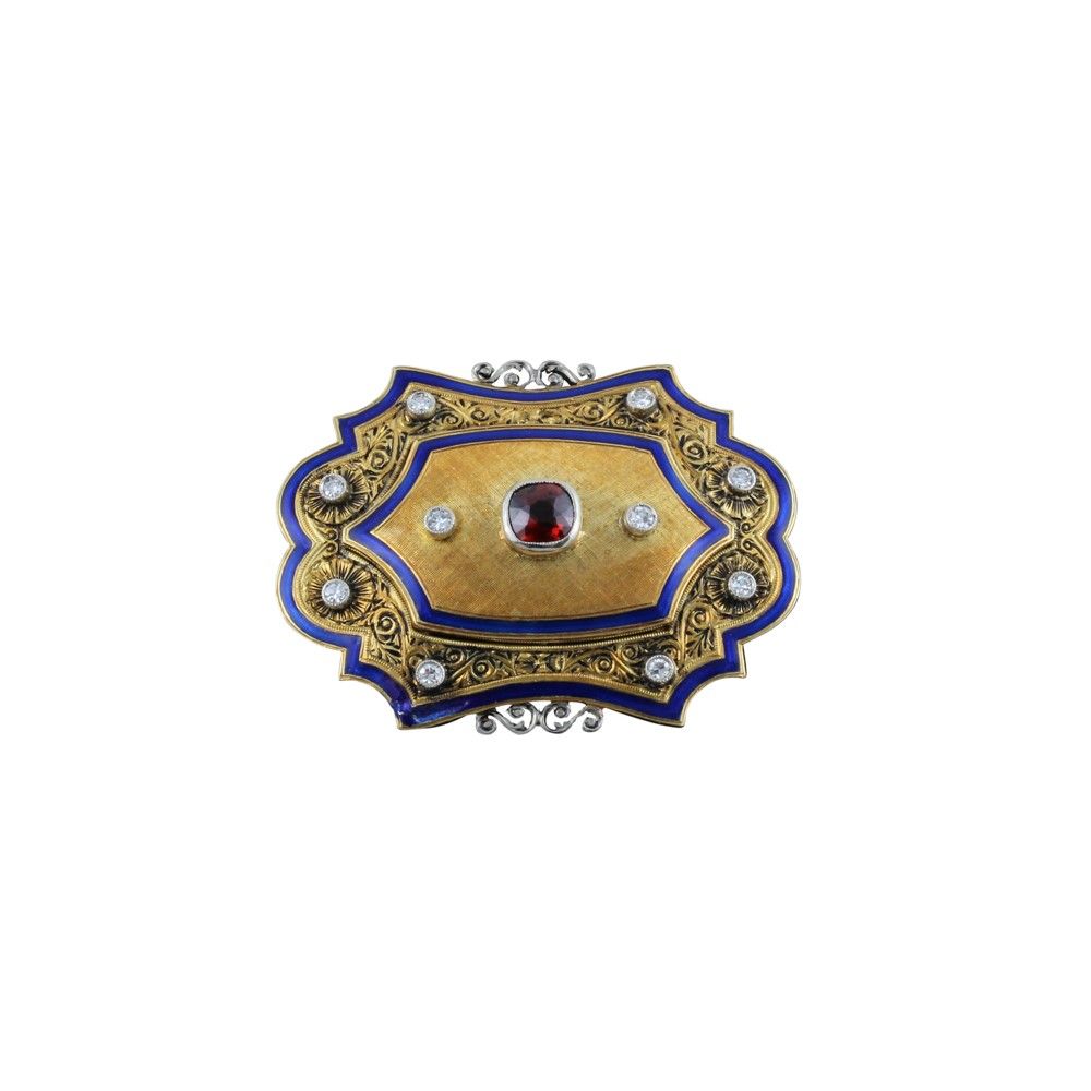 in oro giallo e bianco finemente cesellata, ornata da diamanti e profilata da smalto blu, evidenziata al centro da un granato, gr. 11.