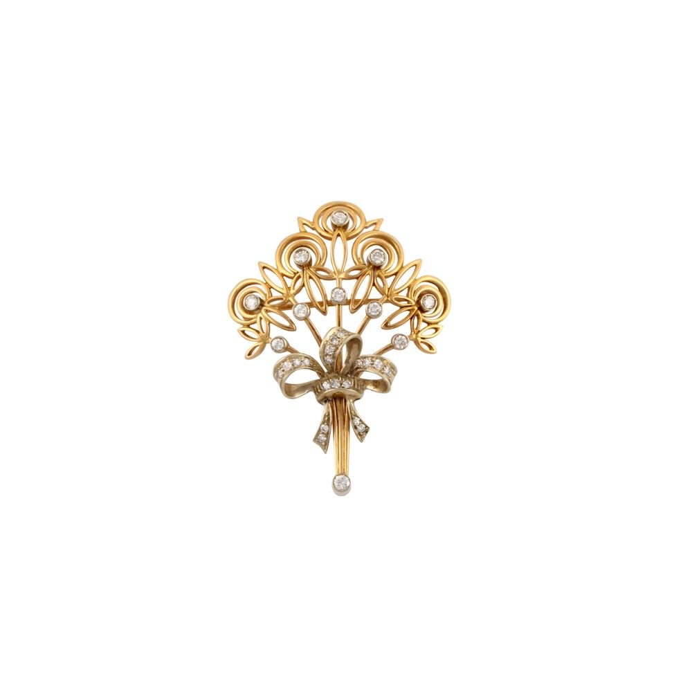 in oro giallo, bianco e diamanti, raffigurante un bouquet stilizzato con fiocco, gr. 12,1.