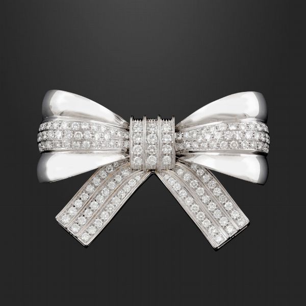 a fiocco in oro rodiato con brillanti del peso complessivo di 7,50 ct ca., gr. 47,4.