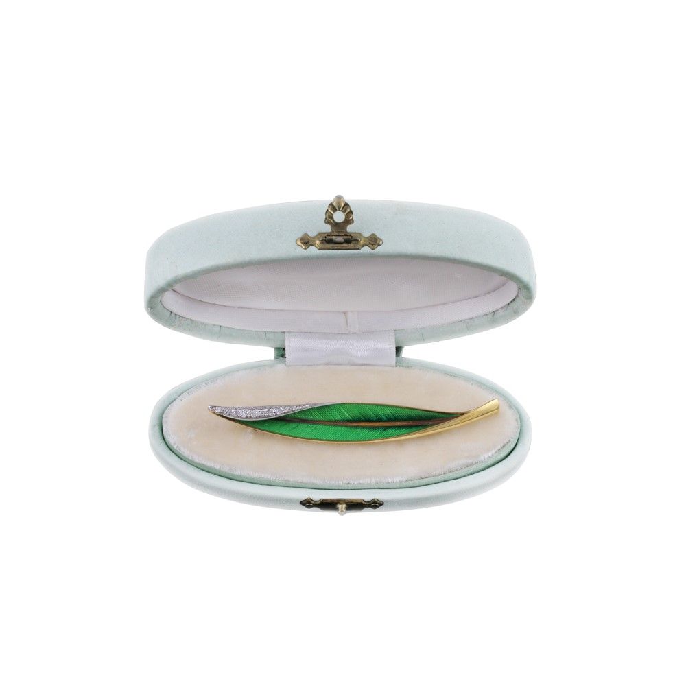 in oro giallo e bianco raffigurante una foglia in smalto verde ornata da piccoli brillanti, gr. 9,5. Corredata da custodia.