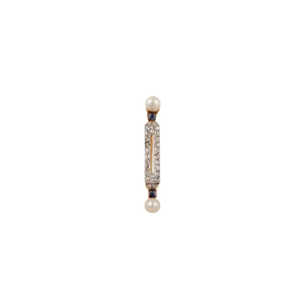a barretta in oro giallo e platino con diamanti taglio a rosa, delimitata alle estremità da zaffiri cabochon e perle, gr. 1,5.