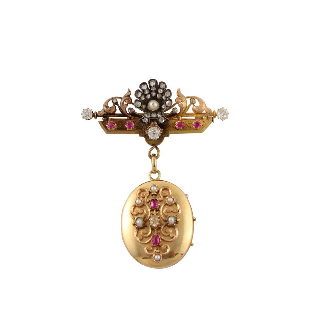 barretta in oro e argento traforata a rocailles culminante con un motivo a conchiglia a sostegno di un portaritratto staccabile ornato da volute, rubini, diamanti e piccole perle, gr. complessivi 20,8.
