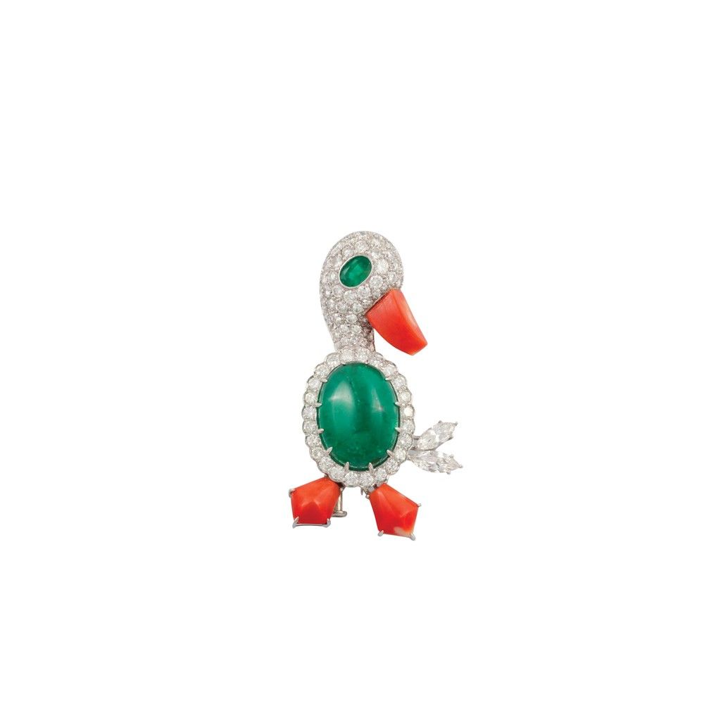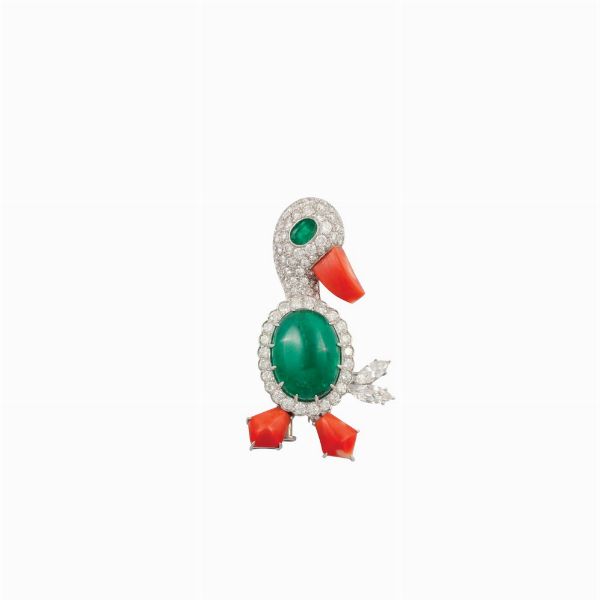in oro bianco raffigurante un papero con brillanti, diamanti navette e smeraldi di cui uno di dimensioni maggiori ovale taglio cabochon del peso di 9 ct ca. Diamanti del peso complessivo di 4 ct ca., gr. 15,5.