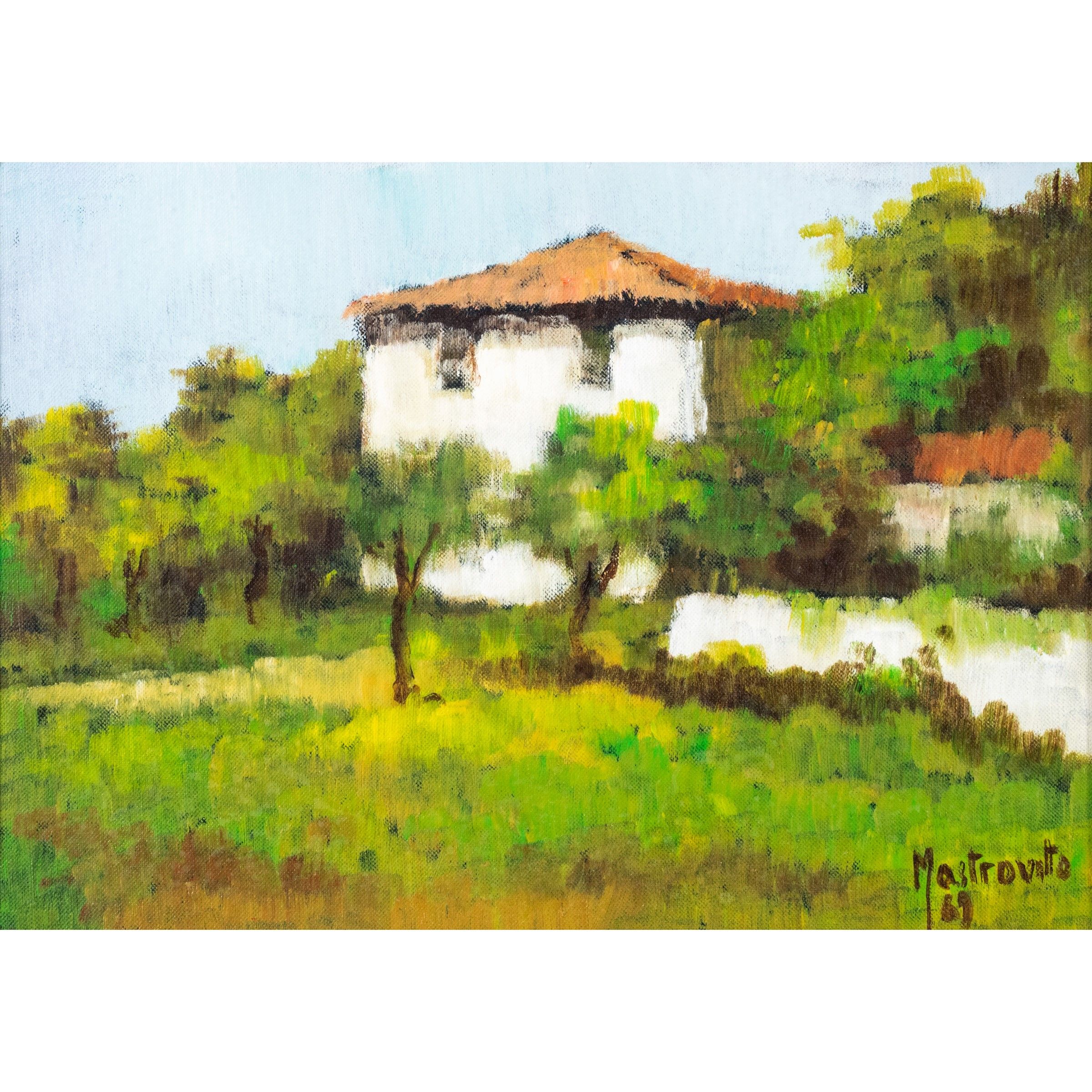 Italia, XX Sec. Paesaggio con casolare, 1989, olio su tela, firmato e datato in basso a destra
