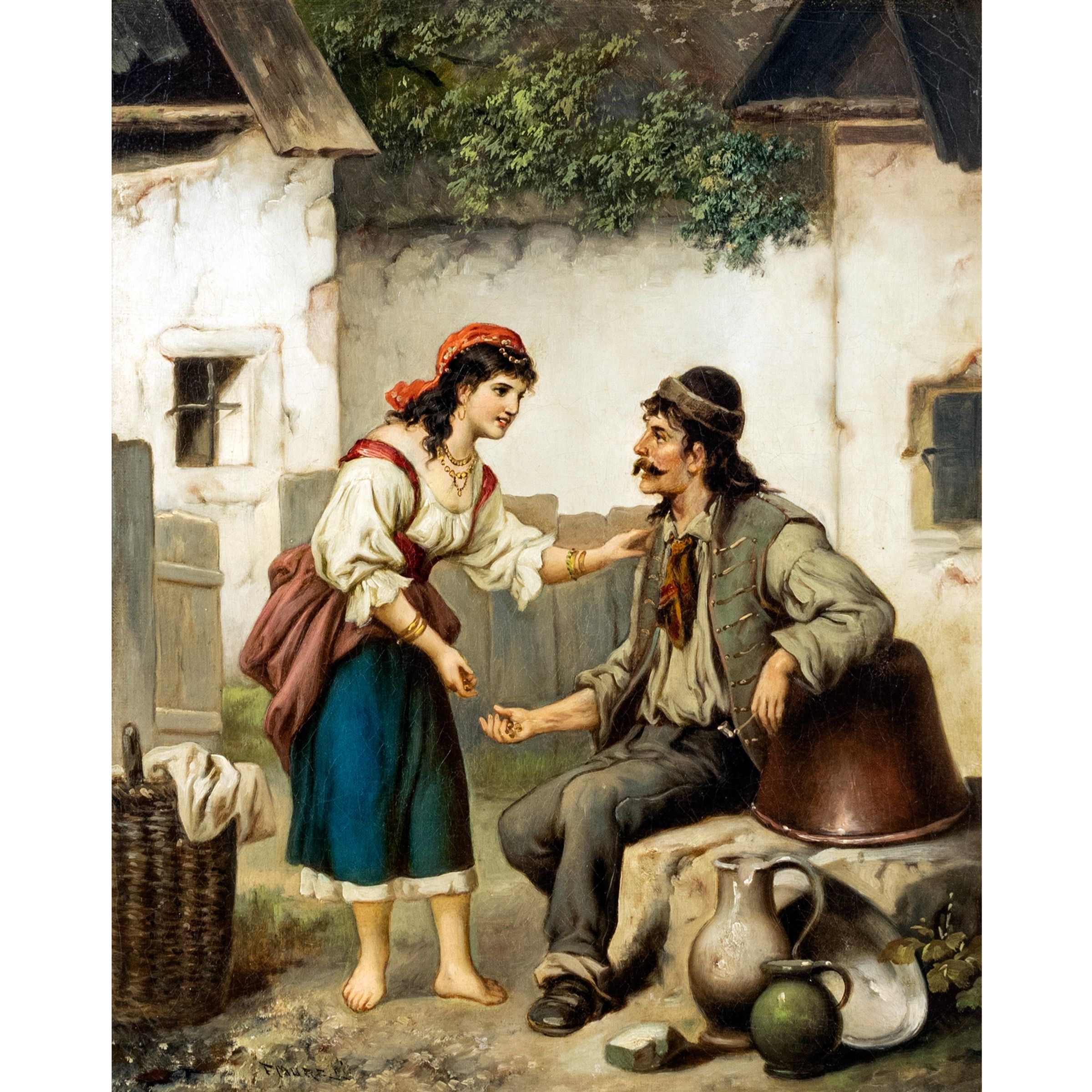 Francia 1768 - Italia 1840 Scorcio con figure, olio su tela, firmato in basso a sinistra, entro cornice in legno dorato