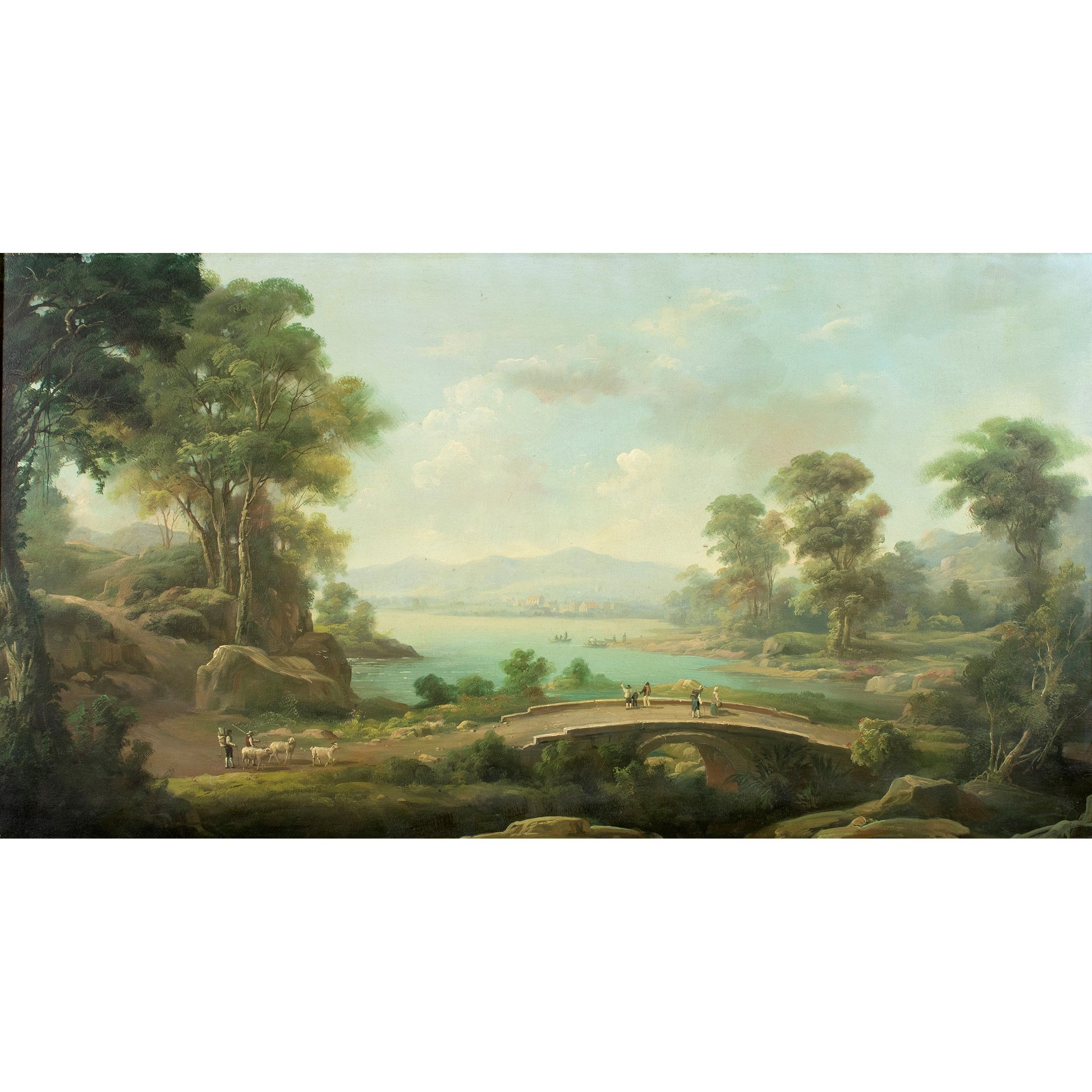 XX Sec. Paesaggio con personaggi e animali, olio su tela