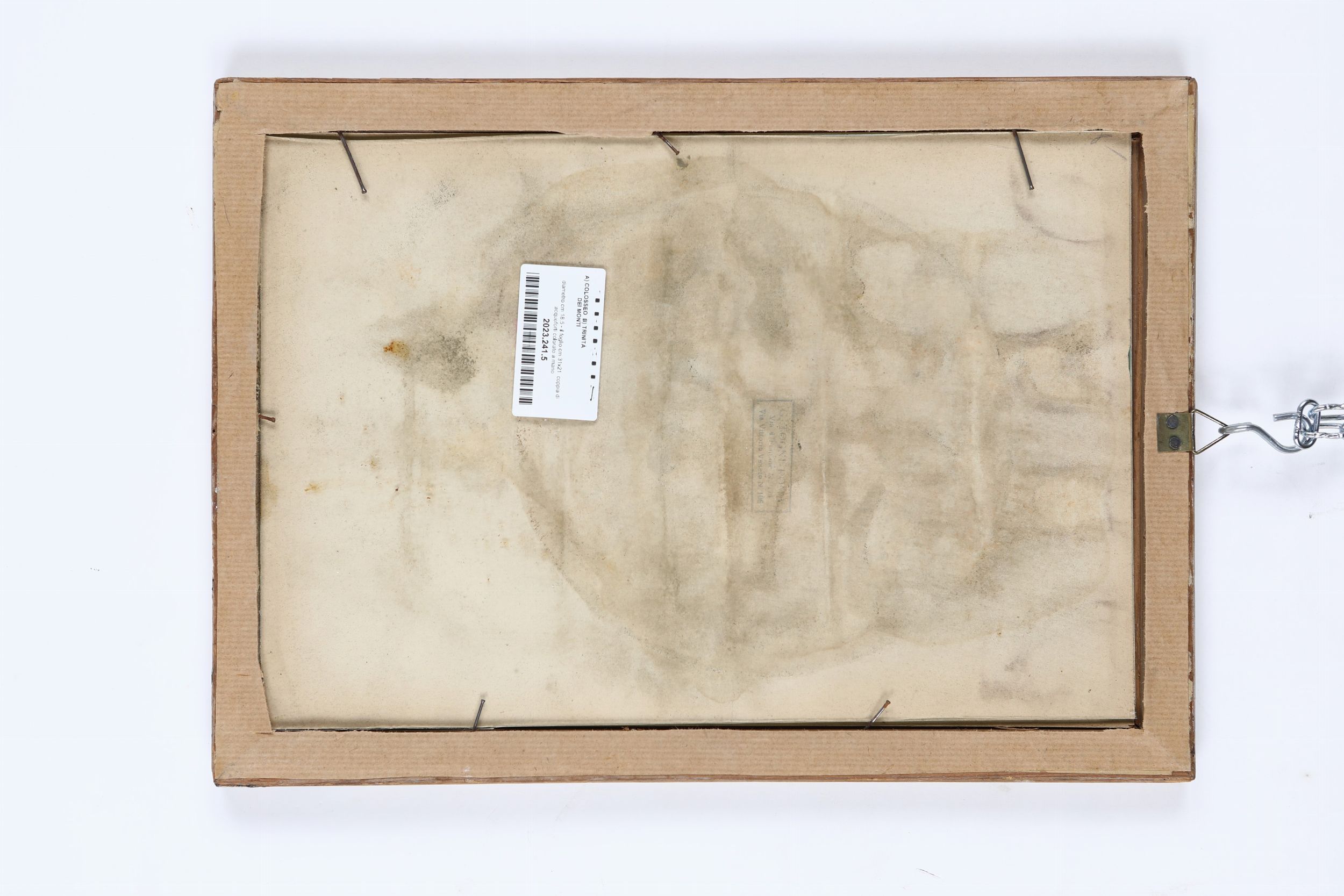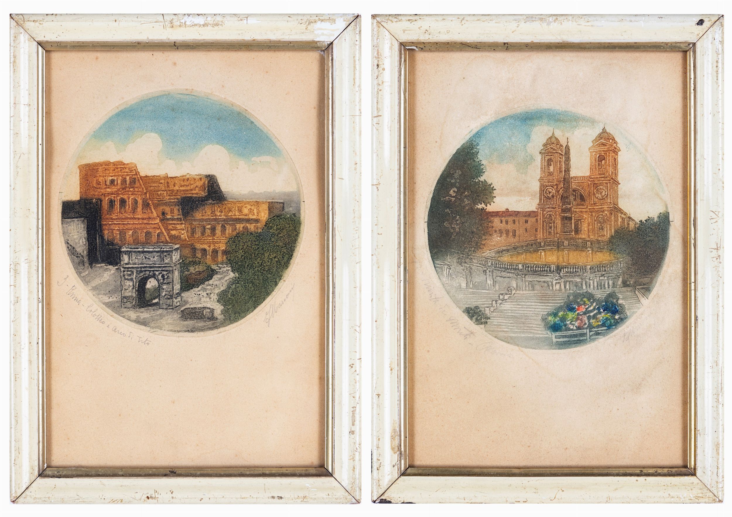 coppia di acqueforti colorate a mano, diametro cm 18,5 - il foglio cm 31x21