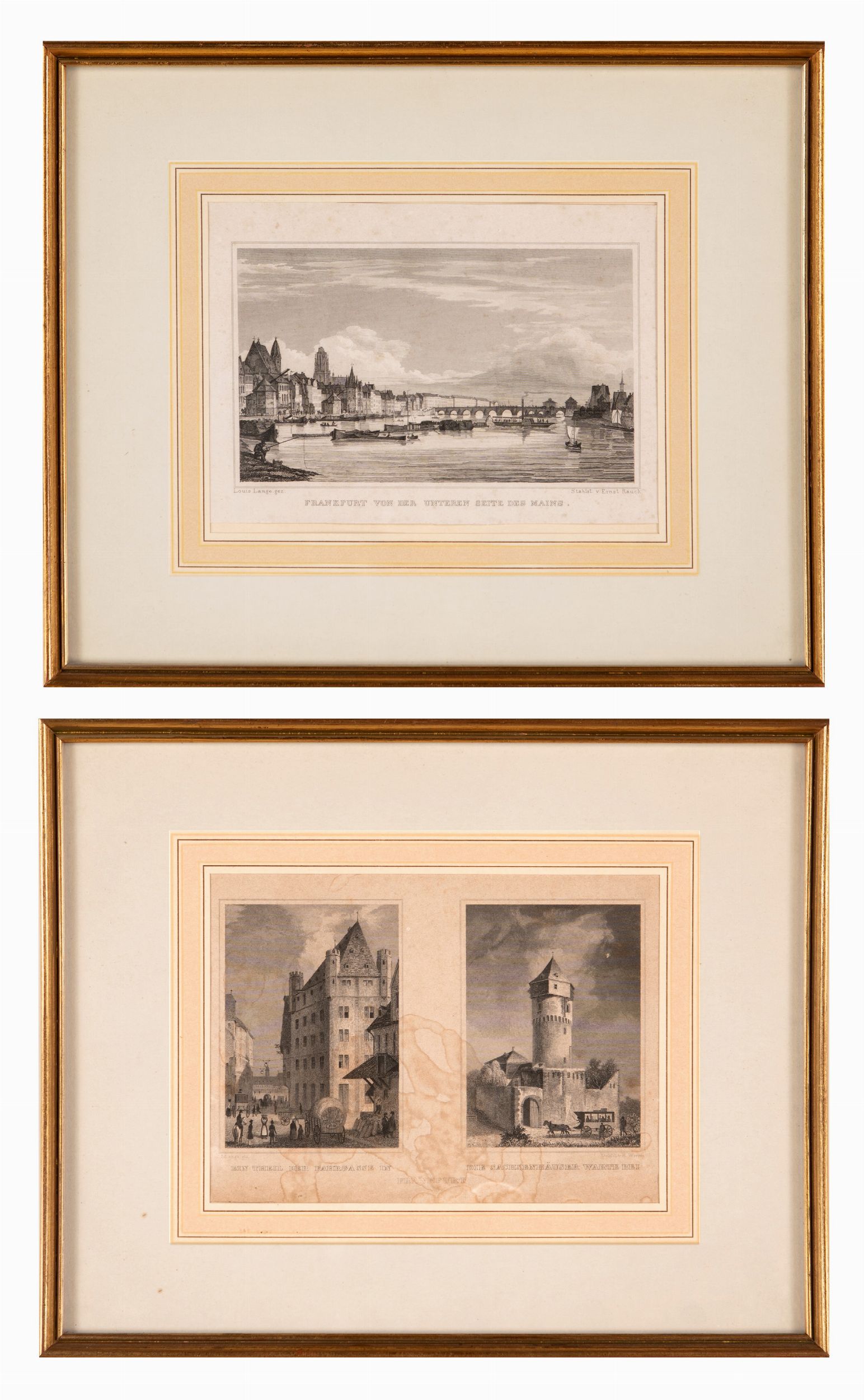 a) Due vedute di edifici di Francoforte b) veduta di Francoforte da fiume Meno